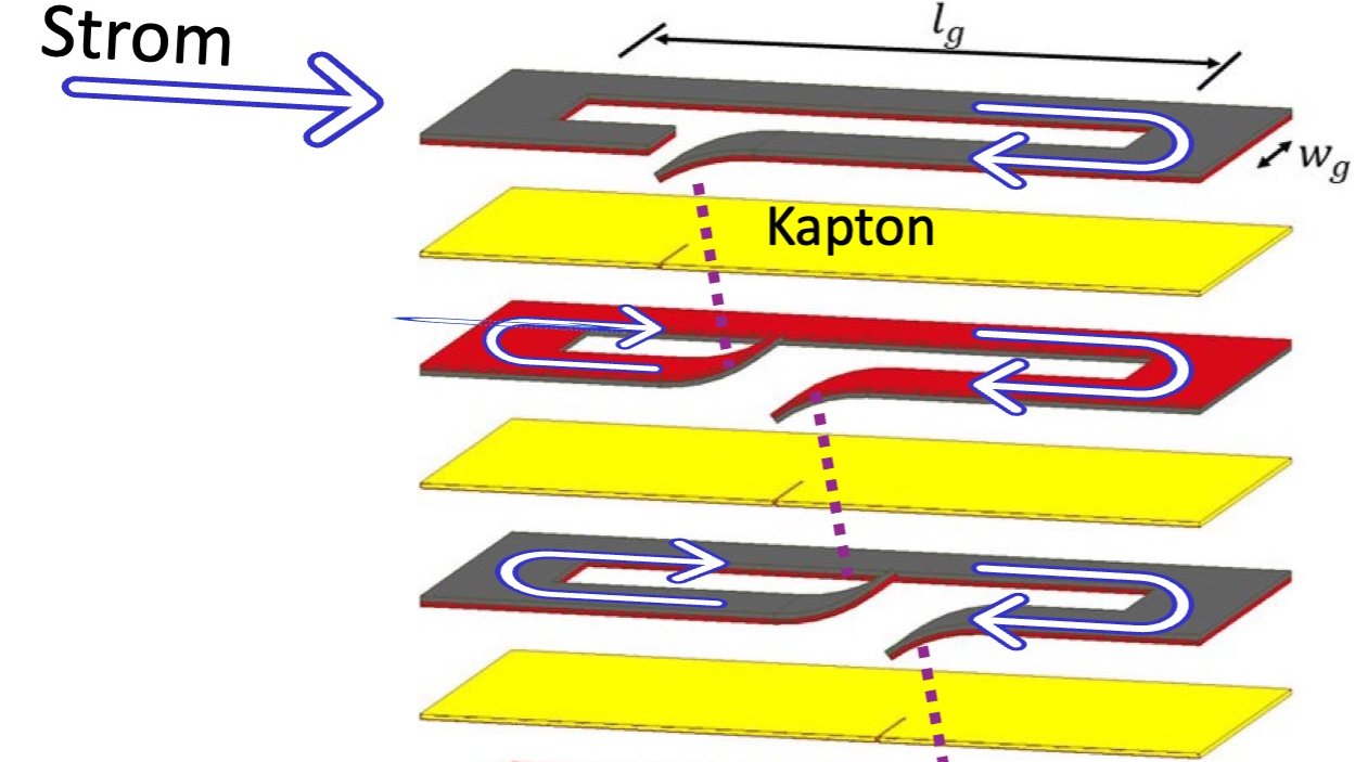 Was genau ist DUDA? DUDA beschreibt eine neuartige, optimierte Spulenkonfiguration. Die Bandleiter werden gestapelt, wobei die Kontaktierung über die HTSL-Seite der Bandleiter erfolgt. Die HTSL-Seiten der Bandleiter zeigen dabei alternierend nach oben und unten. Daher auch das namensgebende Akronym DUDA: Disk-Up-Down-Assemble. Diese kompakten YBCO-DUDA-Spulen aus YBCO-Bandstapeln erzeugen aus Transportströmen hohe, regelbare Magnetfelder. Wir untersuchen in unserem Projekt sowohl rechteckige und ringförmige Spulen mit dieser innovativen Konfiguration.